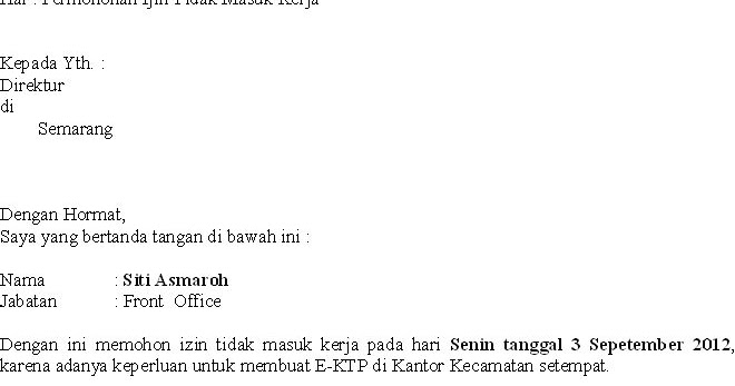 Check spelling or type a new query. Surat ijin tidak masik kerja ditulis suami. We did not find results for: Maybe you would like to learn more about one of these?